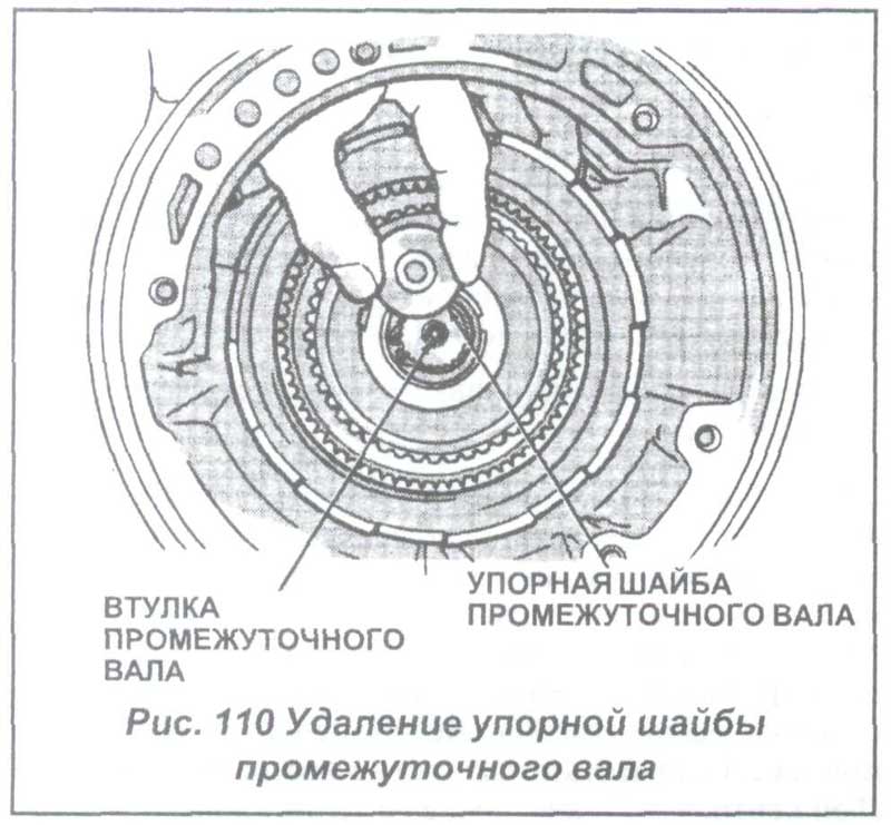 Разборка АКПППродолжение 225) Удалите опорную пластинку выводного вала со втулки промежуточного вала (см.Рис.110). 26) Снимите переднюю полосу передачи с движущегося основания (барабана) (см.Рис.111) и удалите полоску с картера. 27) Удалите планетарную зубчатую передачу в качестве единого узла (см.Рис. 112). При снятии не допускайте механизмам заводского изготовления подвергаться царапинам, повреждениям. 28) Если не производился демонтаж узла ускоряющей передачи, вставьте центровочный инструмент 6227-2 в узел У П, чтобы не допустить сбоя центровки сцеплений УП. 29) Ослабьте на 4-5 оборотов регулировочный винт задней полосы передачи. 30) Удалите стопорное кольцо обратно-понижающего барабана (см.Рис.113). 31) Удалите обратно-понижающий барабан и полосу передачи Задний Ход. 32) Удалите ролик обгонной муфты и пружину как единый узел (см.Рис.114). 33) Сожмите направляющий шток переднего сервопривода примерно на 3.175 мм (1/8 дюйма) с помощью Сжимателя клапанах пружин С-3422-В (см.Рис.115). 34) Удалите стопорное кольцо направляющего штока переднего сервопривода. Соблюдайте при этом осторожность, т.к. можно повредить место установки сервопривода. 35) Удалите компрессорный сжиматель, а также направляющий шток сервопривода, пружину и поршень сервопривода. 36) Сожмите пружинный держатель заднего сервопривода примерно на 1.587 мм (1/16 дюйма) с помощью Компрессора клапанах пружин С-3422-В (см.Рис.116). 37) Удалите стопорное кольцо пружинного держателя заднего сервопривода. Удалите инструменты, снимите пружину и поршень сервопривода. 38) Осмотрите части КПП. Внимание: при обслуживании копира обгонной муфты
